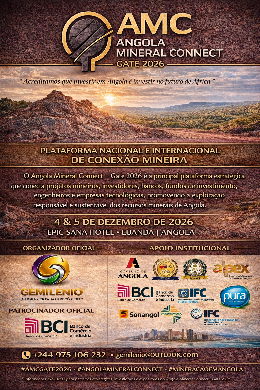 O Angola Mineral Connect – Gate 2026 (AMC Gate 2026) é a principal plataforma nacional e internacional de conexão estratégica do setor mineiro angolano, criada para reunir proprietários de projetos minerais, investidores, bancos, fundos de investimento, empresas mineiras, engenheiros, fornecedores de tecnologia e instituições públicas e privadas.